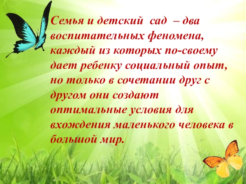 Семья и детский  сад  – два воспитательных феномена, каждый из которых по-своему дает ребенку социальный опыт, но только в сочетании друг с другом они создают оптимальные условия для вхождения маленького человека в большой мир.