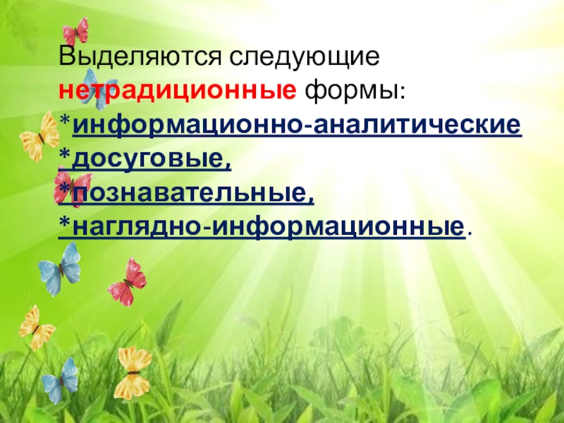 Выделяются следующие нетрадиционные формы: *информационно-аналитические *досуговые, *познавательные, *наглядно-информационные.