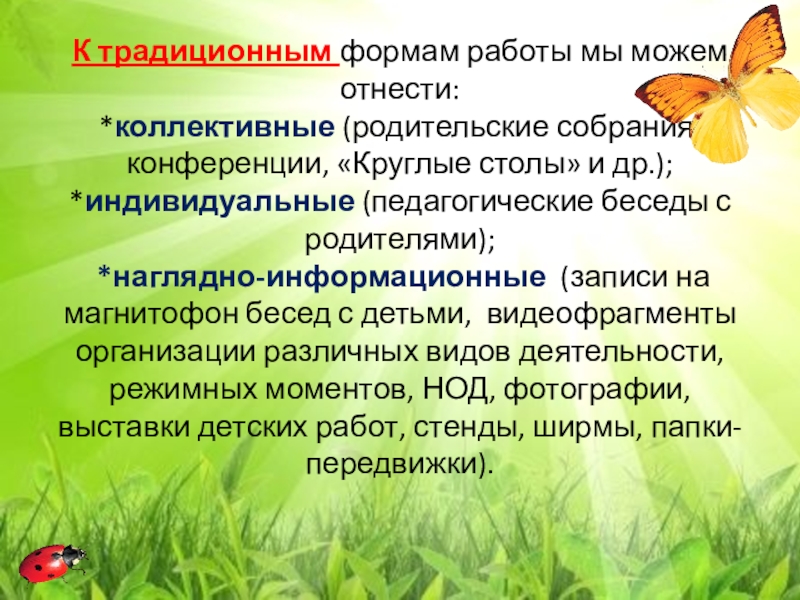 Слайд 6К традиционным формам работы мы можем отнести: *коллективные (родительские собрания, конференции, «Круглые