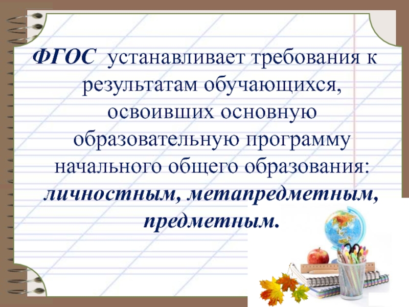 ФГОС устанавливает требования к результатам обучающихся, освоивших основную образовательную