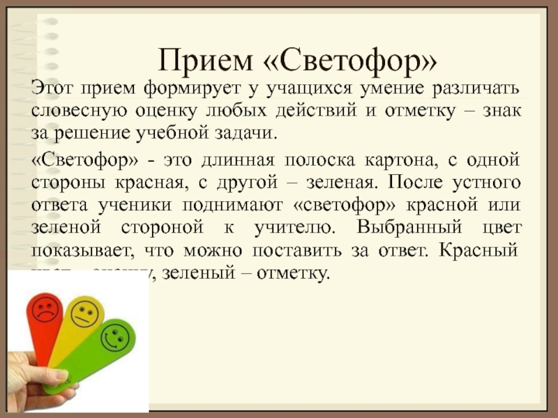 «Светофор» - это длинная полоска картона, с одной стороны красная, с другой – зеленая. После устного ответа ученики поднимают «светофор» красной или зеленой стороной к учителю. Выбранный цвет показывает, что можно поставить за ответ. Красный цвет – оценку, зеленый – отметку.