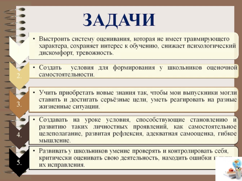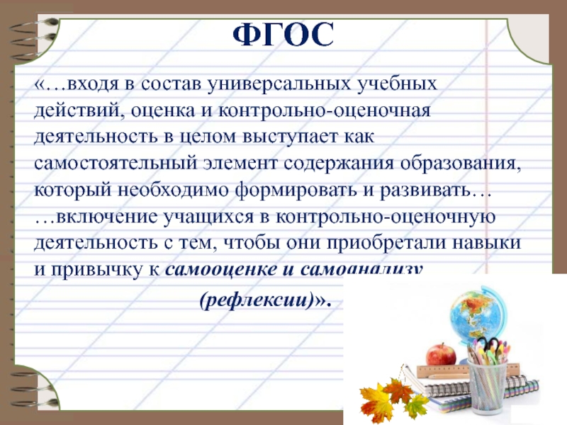 …включение учащихся в контрольно-оценочную деятельность с тем, чтобы они приобретали навыки и привычку к самооценке и самоанализу
