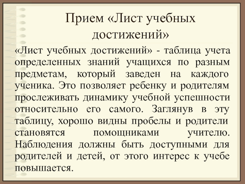 учащихся по разным предметам, который заведен на каждого ученика. Это позволяет ребенку и родителям прослеживать динамику учебной успешности относительно его самого. Заглянув в эту таблицу, хорошо видны пробелы и родители становятся помощниками учителю. Наблюдения должны быть доступными для родителей и детей, от этого интерес к учебе повышается.