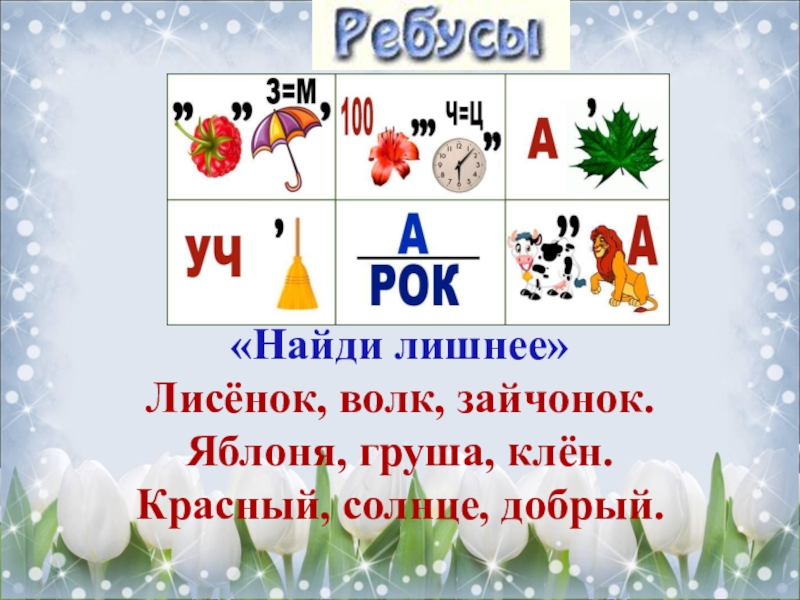 Ребусы, загадки, «Найди лишнее»