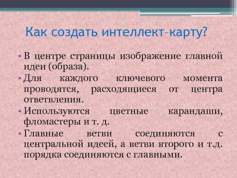 Главные ветви соединяются с центральной идеей, а ветви второго и т.д. порядка соединяются с главными.