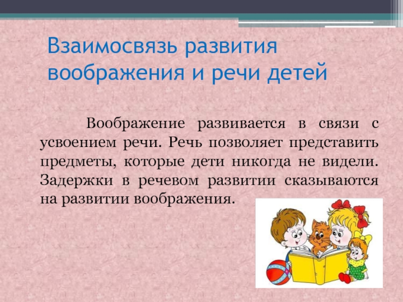 связи с усвоением речи. Речь позволяет представить предметы, которые дети никогда не видели. Задержки в речевом развитии сказываются на развитии воображения.