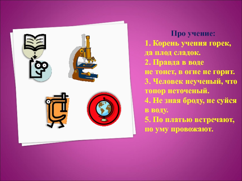 Пословицы и поговорки оттачивают мысль, они учат, воспитывают, направляют, активно приобщают человека к богатствам народного языка.