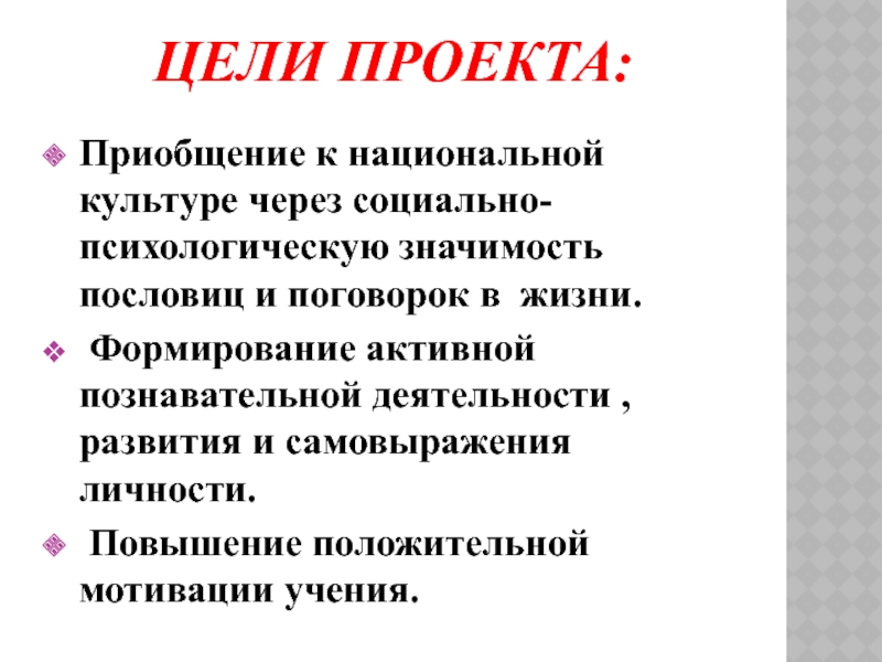 Слайд 6ПРОЕКТ: ИЗУЧЕНИЕ НАЦИОНАЛЬНОЙ КУЛЬТУРЫ ЧЕРЕЗ ПОСЛОВИЦЫ И ПОГОВОРКИ