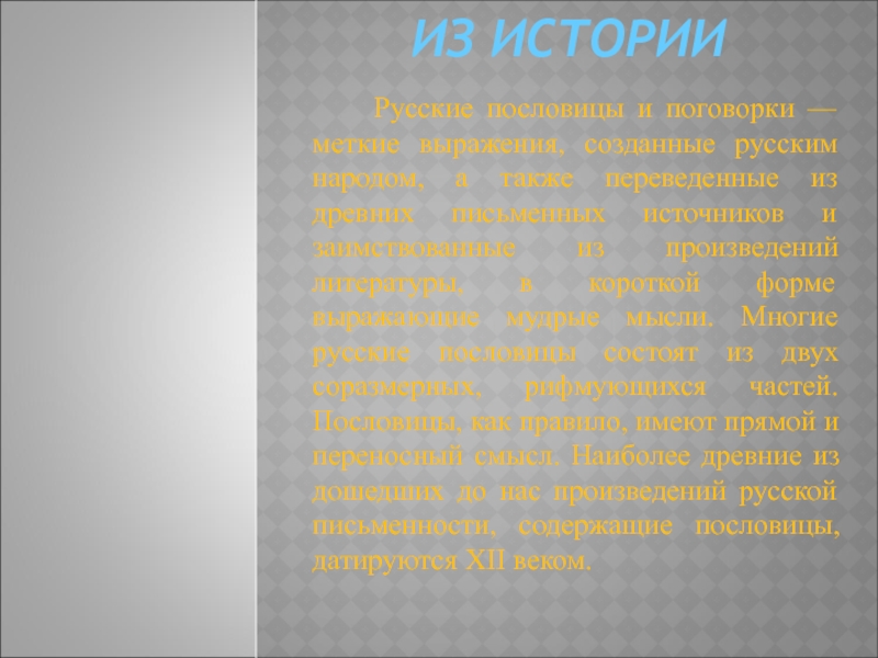 созданные русским народом, а также переведенные из древних письменных источников и заимствованные из произведений литературы, в короткой форме выражающие мудрые мысли. Многие русские пословицы состоят из двух соразмерных, рифмующихся частей. Пословицы, как правило, имеют прямой и переносный смысл. Наиболее древние из дошедших до нас произведений русской письменности, содержащие пословицы, датируются XII веком.