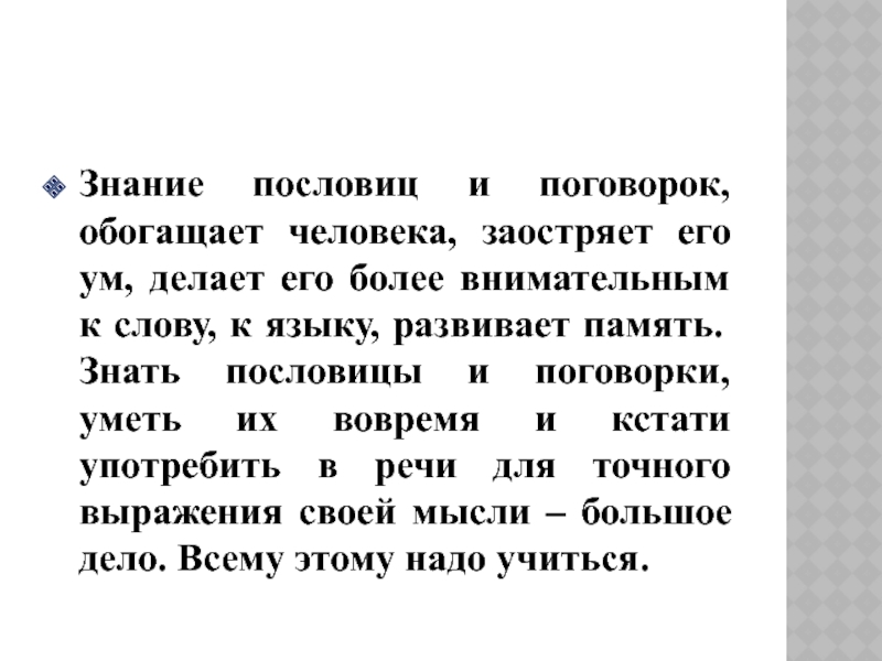 Знание пословиц и поговорок, обогащает человека, заостряет его ум, делает его