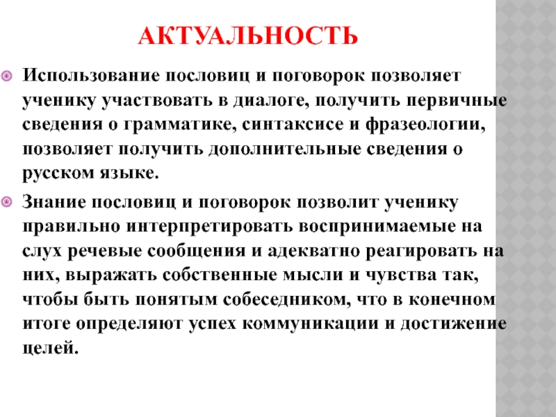 Знание пословиц и поговорок позволит ученику правильно интерпретировать воспринимаемые на слух речевые сообщения и адекватно реагировать на них, выражать собственные мысли и чувства так, чтобы быть понятым собеседником, что в конечном итоге определяют успех коммуникации и достижение целей.