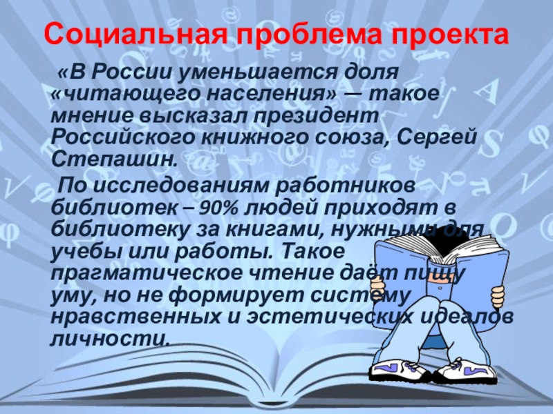 По исследованиям работников библиотек – 90% людей приходят в библиотеку за книгами, нужными для учебы или работы. Такое прагматическое чтение даёт пищу уму, но не формирует систему нравственных и эстетических идеалов личности.
