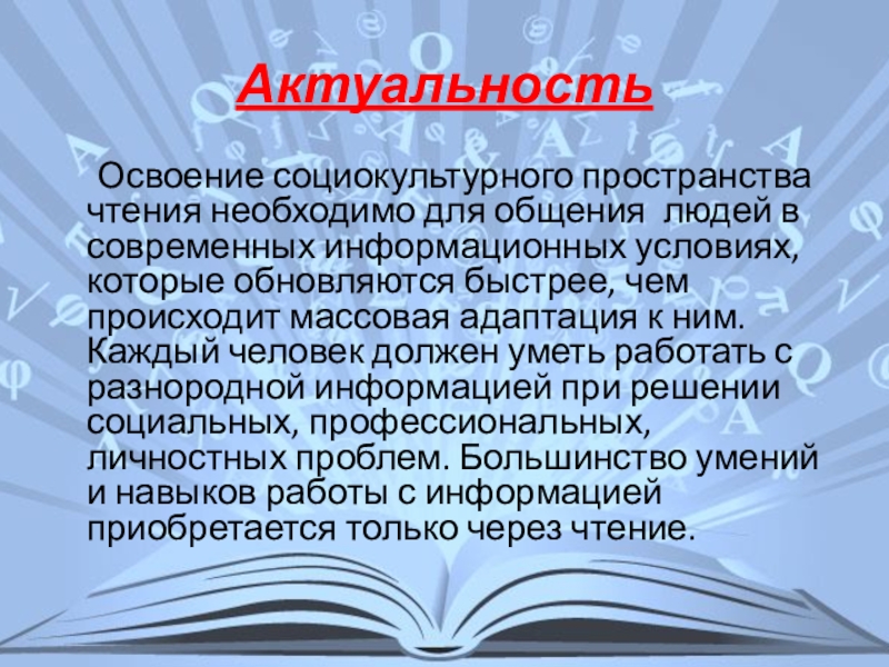 условиях, которые обновляются быстрее, чем происходит массовая адаптация к ним. Каждый человек должен уметь работать с разнородной информацией при решении социальных, профессиональных, личностных проблем. Большинство умений и навыков работы с информацией приобретается только через чтение.