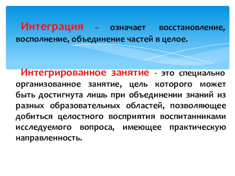 Интеграция – означает восстановление, восполнение, объединение частей в целое. Интегрированное занятие - это специально организованное занятие, цель которого может быть достигнута лишь при объединении знаний из разных образовательных областей, позволяющее добиться целостного восприятия воспитанниками исследуемого вопроса,