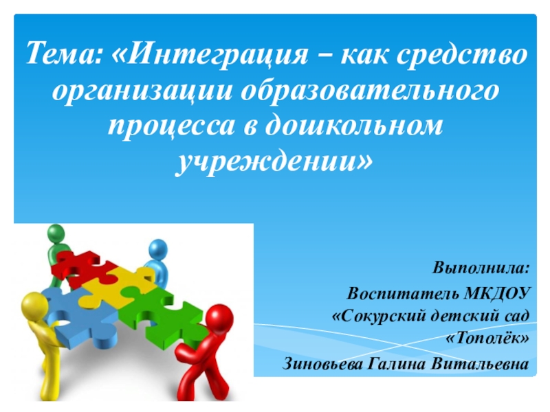 Тема: «Интеграция – как средство организации образовательного процесса в дошкольном учреждении»Выполнила: Воспитатель МКДОУ «Сокурский детский сад «Тополёк»Зиновьева