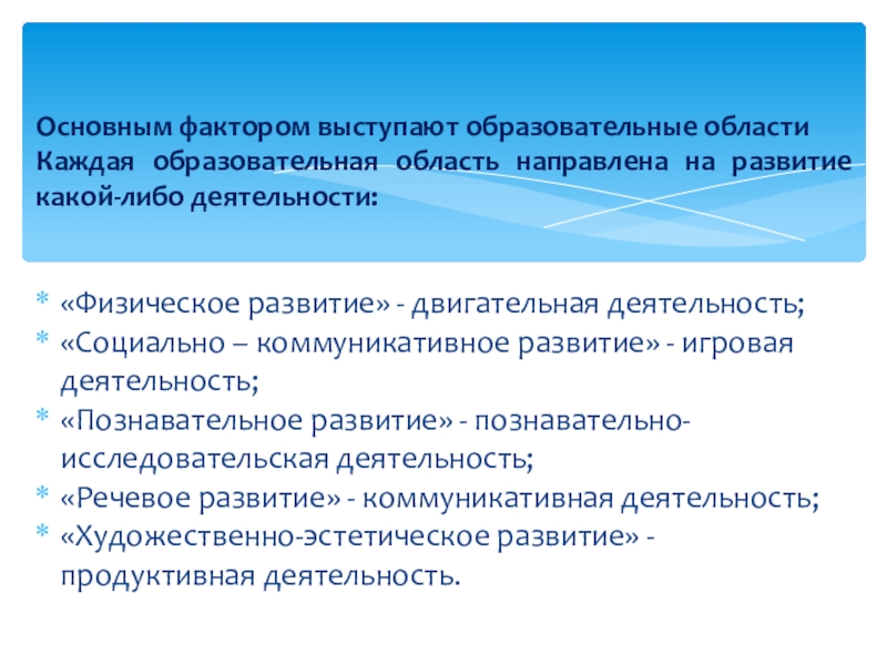 Основным фактором выступают образовательные областиКаждая образовательная область направлена на развитие какой-либо деятельности:«Физическое развитие» - двигательная деятельность;«Социально –