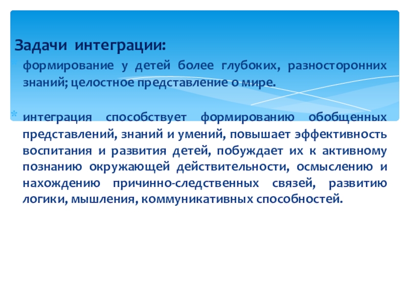 Задачи интеграции:формирование у детей более глубоких, разносторонних знаний; целостное представление о мире. интеграция способствует формированию обобщенных
