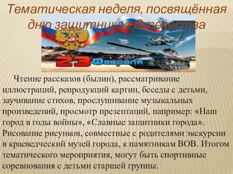Слайд 9Тематическая неделя, посвящённая дню защитников Отечества