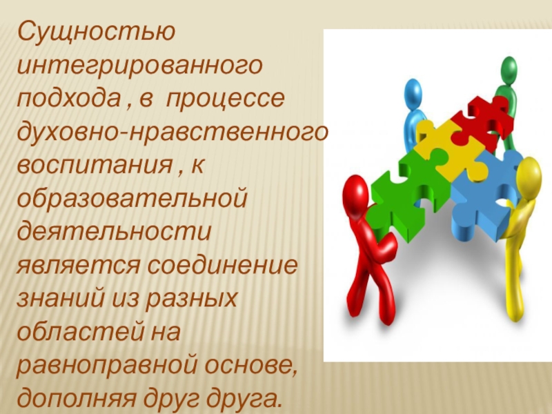 Слайд 8Сущностью интегрированного подхода , в процессе духовно-нравственного воспитания , к образовательной