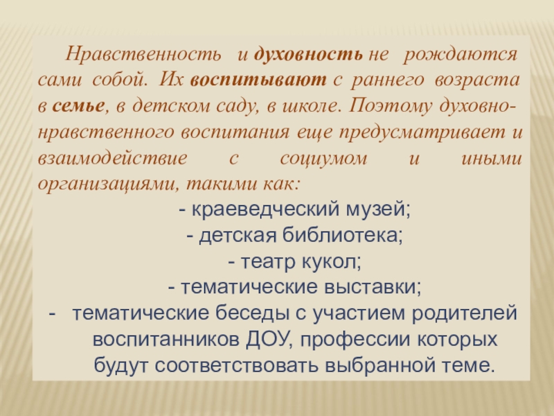 саду, в школе. Поэтому духовно-нравственного воспитания еще предусматривает и взаимодействие с социумом и иными организациями, такими как:
