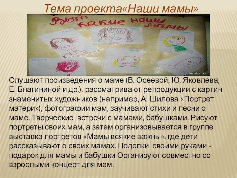 Е. Благининой и др.), рассматривают репродукции с картин знаменитых художников (например, А. Шилова «Портрет матери»), фотографии мам, заучивают стихи и песни о маме. Творческие встречи с мамами, бабушками. Рисуют портреты своих мам, а затем организовывается в группе выставка портретов «Мамы всякие важны», где дети рассказывают о своих мамах. Поделки своими руками -подарок для мамы и бабушки Организуют совместно со взрослыми концерт для мам.