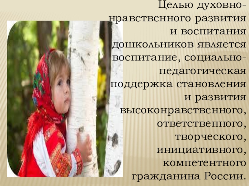 Слайд 3Целью духовно-нравственного развития и воспитания дошкольников является воспитание, социально-педагогическая поддержка становления и