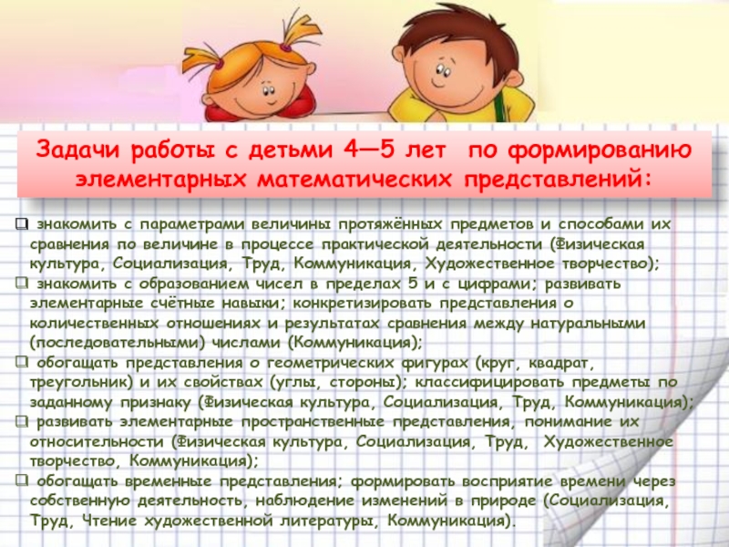 знакомить с параметрами величины протяжённых предметов и способами их сравнения по величине в процессе практической деятельности (Физическая культура, Социализация, Труд, Коммуникация, Художественное творчество);