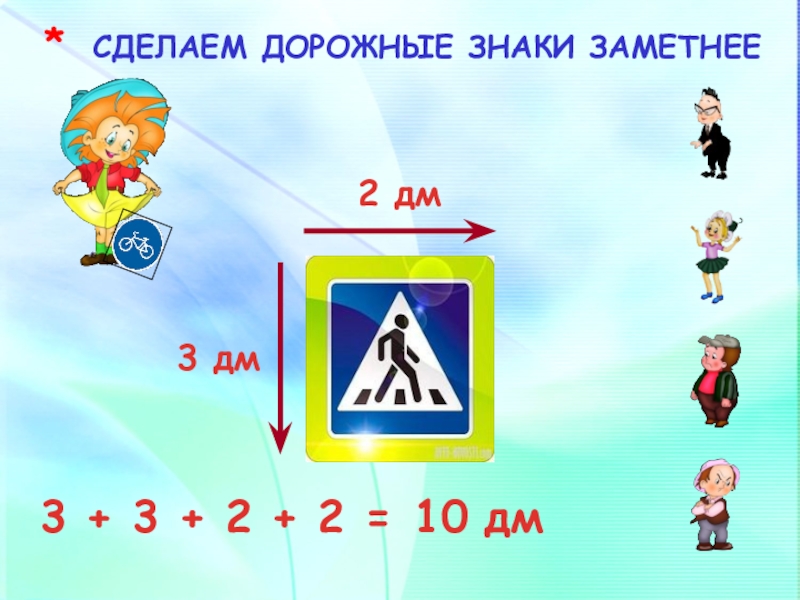 * СДЕЛАЕМ ДОРОЖНЫЕ ЗНАКИ ЗАМЕТНЕЕ3 + 3 + 2 + 2 =10дм