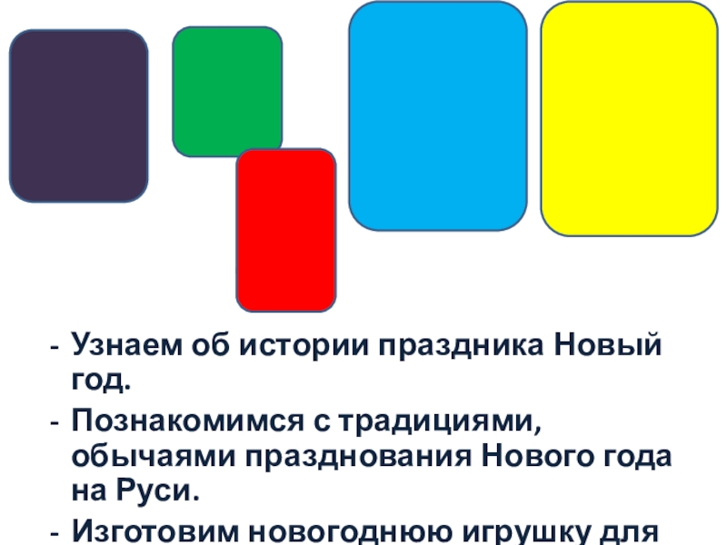 Узнаем об истории праздника Новый год.Познакомимся с традициями, обычаями празднования Нового года на Руси.Изготовим новогоднюю игрушку для