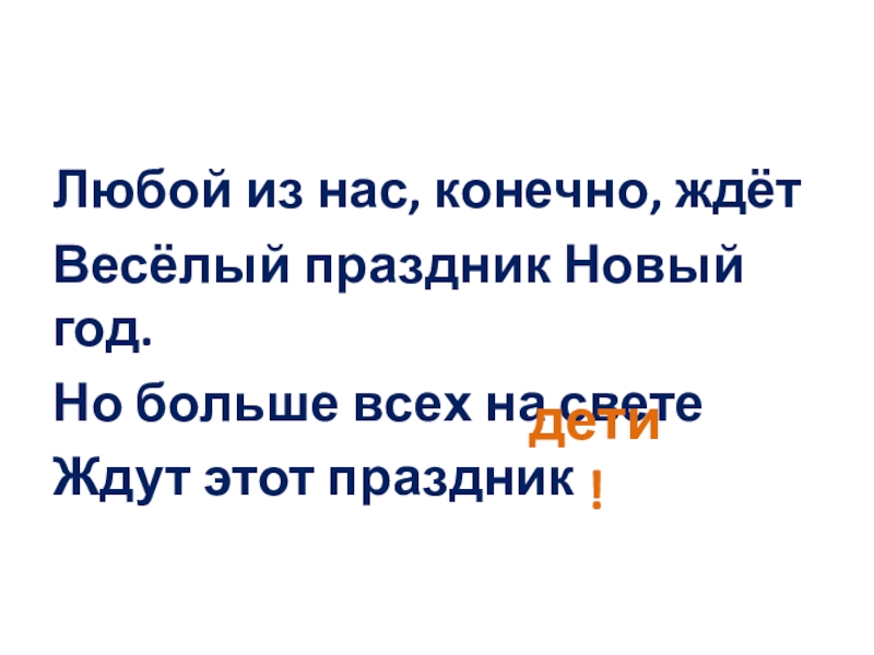 Любой из нас, конечно, ждётВесёлый праздник Новый год.Но больше всех на свете Ждут этот праздникдети!