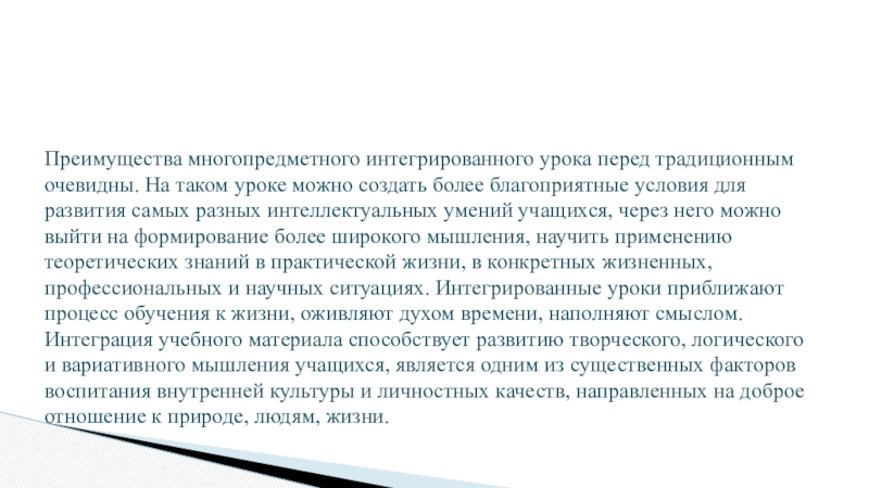 Слайд 16Преимущества многопредметного интегрированного урока перед традиционным очевидны. На таком уроке можно создать более благоприятные условия