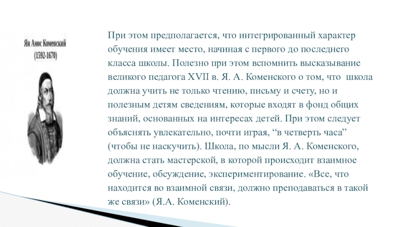 При этом предполагается, что интегрированный характер обучения имеет место, начиная с первого до последнего класса школы. Полезно при этом вспомнить высказывание великого педагога XVII в. Я. А. Коменского о том, что школа должна учить не только чтению, письму и счету, но и полезным детям сведениям, которые входят в фонд общих знаний, основанных на интересах детей. При этом следует объяснять увлекательно, почти играя, “в четверть часа” (чтобы не наскучить). Школа, по мысли Я. А. Коменского, должна стать мастерской, в которой происходит взаимное обучение, обсуждение, экспериментирование. «Все, что находится во взаимной связи, должно преподаваться в такой же связи» (Я.А. Коменский).