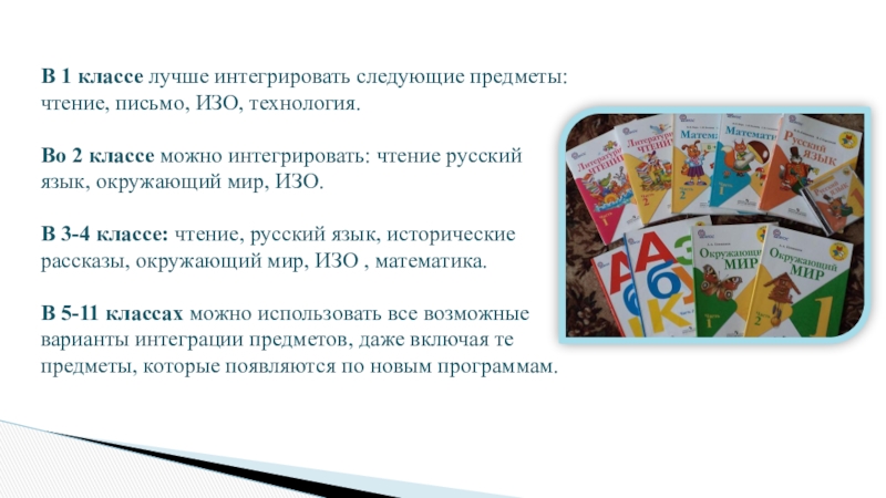 Слайд 20В 1 классе лучше интегрировать следующие предметы: