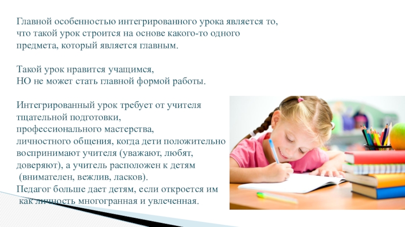Слайд 14Главной особенностью интегрированного урока является то, что такой урок строится на