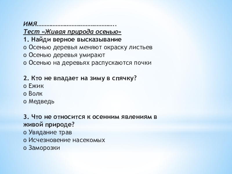 ИМЯ…………………………………………..Тест «Живая природа осенью»1. Найди верное высказывание o Осенью деревья меняют окраску листьевo Осенью деревья умираютo Осенью