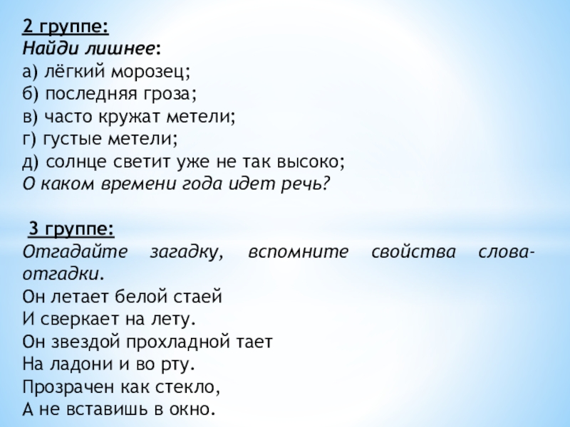 2 группе: Найди лишнее:а) лёгкий морозец;б) последняя гроза;в) часто кружат метели;г) густые метели;д) солнце светит уже не