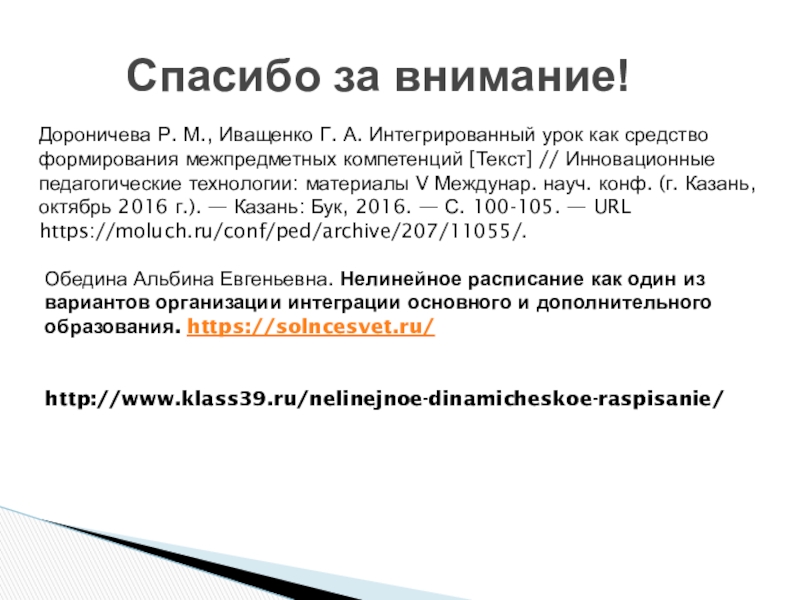 Обедина Альбина Евгеньевна. Нелинейное расписание как один из вариантов организации интеграции основного и дополнительного образования. https://solncesvet.ru/