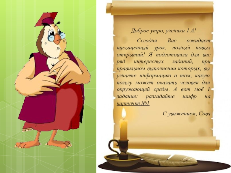новых открытий! Я подготовила для вас ряд интересных заданий, при правильном выполнении которых, вы узнаете информацию о том, какую пользу может оказать человек для окружающей среды. А вот моё 1 задание: разгадайте шифр на карточке №1