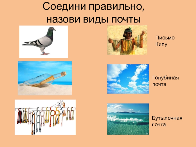 Соедини правильно,  назови виды почтыПисьмо КипуГолубиная почтаБутылочная почта