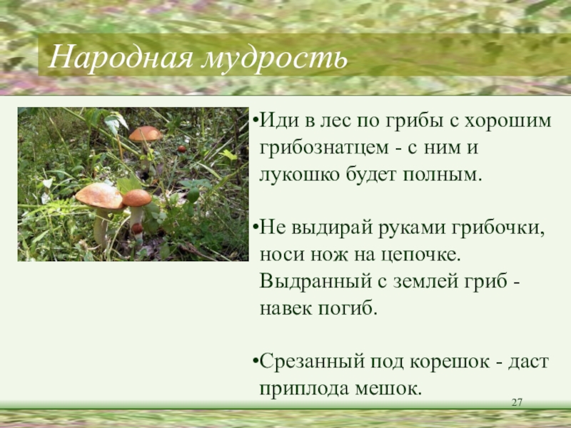 Объясни поговорку, прочитай приметы о грибах.