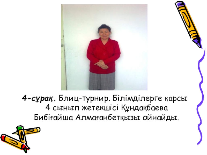 4-сұрақ. Блиц-турнир. Білімділерге қарсы 4 сынып жетекшісі Құндақбаева Бибіғайша