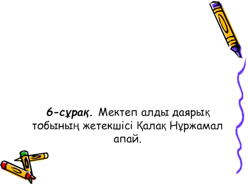 6-сұрақ. Мектеп алды даярық тобының жетекшісі Қалақ Нұржамал апай.