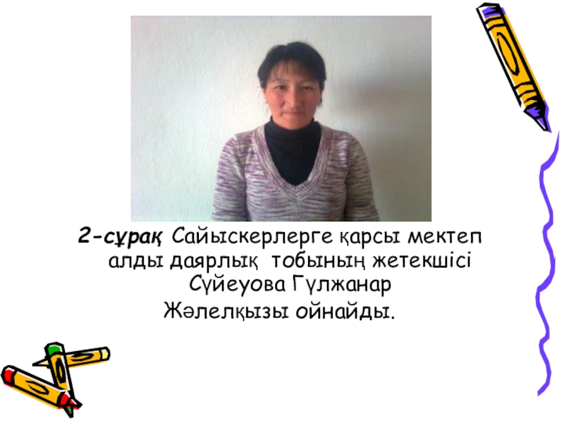 2-сұрақ Сайыскерлерге қарсы мектеп алды даярлық тобының жетекшісі Сүйеуова Гүлжанар