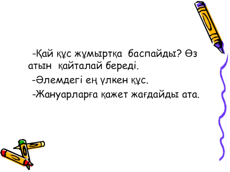 Слайд 24 -Қай құс жұмыртқа баспайды? Өз атын қайталай береді.