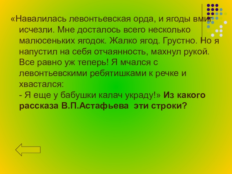 малюсеньких ягодок. Жалко ягод. Грустно. Но я напустил на себя отчаянность, махнул рукой. Все равно уж теперь! Я мчался с левонтьевскими ребятишками к речке и хвастался:  - Я еще у бабушки калач украду!» Из какого рассказа В.П.Астафьева эти строки?