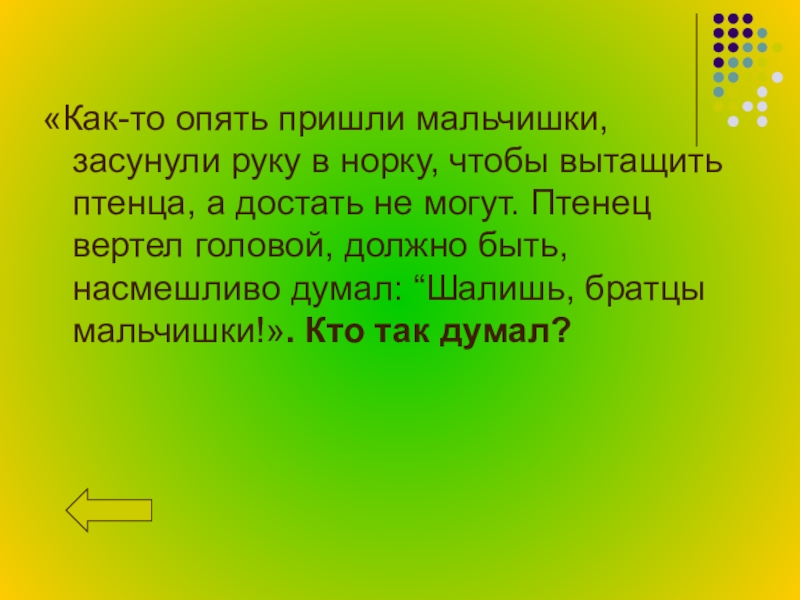 а достать не могут. Птенец вертел головой, должно быть, насмешливо думал: “Шалишь, братцы мальчишки!». Кто так думал?