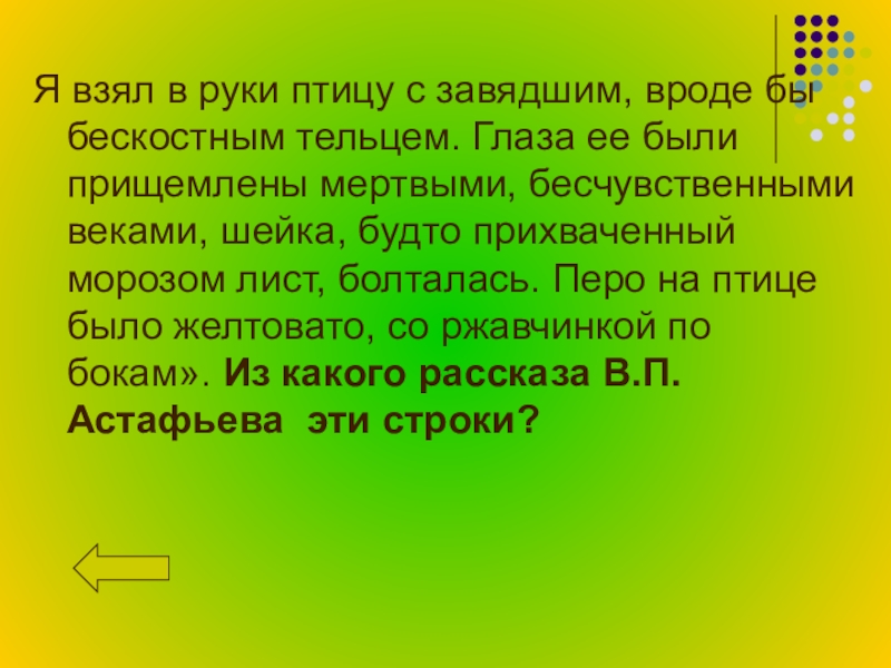 Глаза ее были прищемлены мертвыми, бесчувственными веками, шейка, будто прихваченный морозом лист, болталась. Перо на птице было желтовато, со ржавчинкой по бокам». Из какого рассказа В.П.Астафьева эти строки?