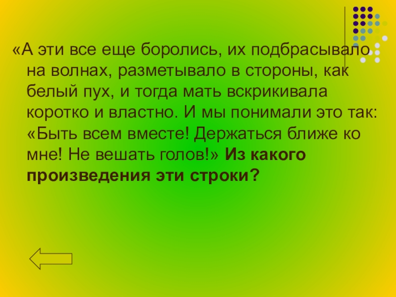 стороны, как белый пух, и тогда мать вскрикивала коротко и властно. И мы понимали это так: «Быть всем вместе! Держаться ближе ко мне! Не вешать голов!» Из какого произведения эти строки?