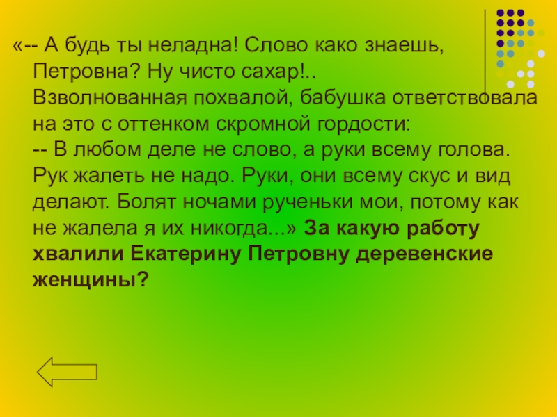 сахар!.. Взволнованная похвалой, бабушка ответствовала на это с оттенком скромной гордости: -- В любом деле не слово, а руки всему голова. Рук жалеть не надо. Руки, они всему скус и вид делают. Болят ночами рученьки мои, потому как не жалела я их никогда...» За какую работу хвалили Екатерину Петровну деревенские женщины?
