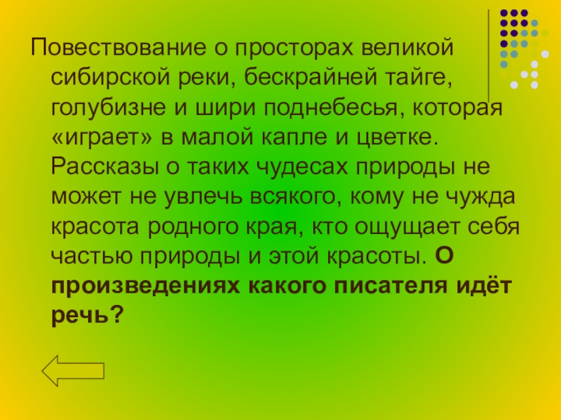 поднебесья, которая «играет» в малой капле и цветке. Рассказы о таких чудесах природы не может не увлечь всякого, кому не чужда красота родного края, кто ощущает себя частью природы и этой красоты. О произведениях какого писателя идёт речь?